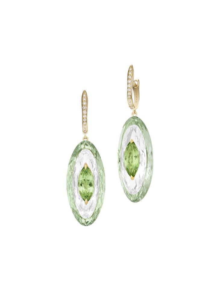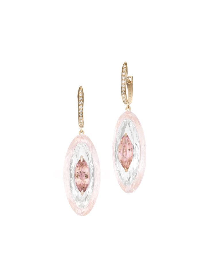 In this new chapter of Inlay Shine, Boghossian explores delicate colour harmonies. Pairings such as prasiolite with green tourmaline, rose quartz with morganite, and sky blue topaz with aquamarine are each enhanced by a layer of rock crystal, amplifying luminosity while preserving the softness of the pastel palette.