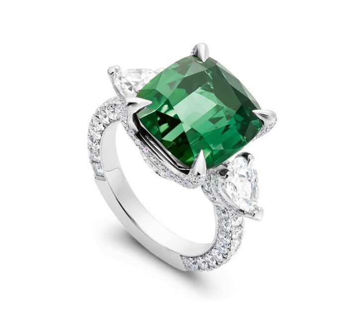 At the centre of the ring sits an extraordinary cushion-cut, 9.33-carat tourmaline, whose shimmering play of colours shifts between peacock green and deep blue. The stone is flanked by two pear-cut diamonds with a total of 1.03 carats and 171 brilliant-cut diamonds totalling 1.73 carats. The ring itself is 18k white gold. This is a rare statement piece with expressive power.