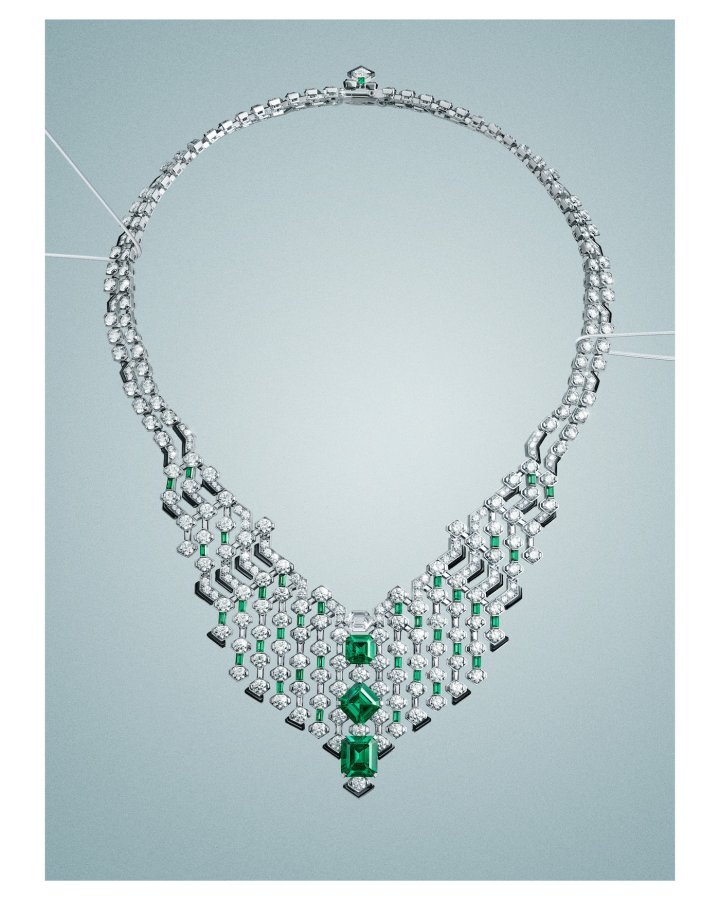 Then there are the stones: emeralds from Colombia, transformed into a cascade of faceted beads of different sizes and weights. From its intense colours to the impression of fluidity and its supple drape, everything comes to life thanks to the threading technique, which requires respect for the design, the curves and the layering. The iridescent material intensifies the light through the facets of each stone. Their uniqueness has a lifelike beauty.