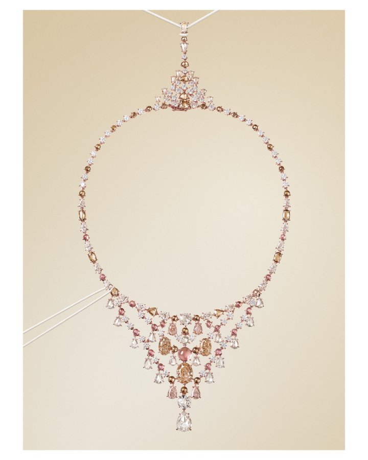Hyala is a creation that sits as lightly as a veil over the skin, with an array of diamonds and coloured sapphires. For this necklace, the delicate workmanship of the rose gold gives the impression that the stones are set directly onto the neck.