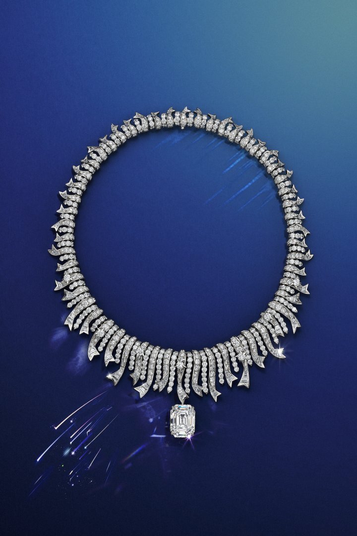 Created by Nathalie Verdeille and the Tiffany & Co. Design Studio, the Shooting Star necklace from the Tiffany Céleste Blue Book high jewelry collection features a striking motif that evokes the splendor of a shooting star through the movement of a whimsical ribbon design, a signature House motif. Showcasing a breathtaking D-color, internally flawless Type IIa emerald-cut diamond of nearly 19 carats, this extraordinary necklace is a testament to Tiffany & Co.’s authority on exquisite diamonds. The central diamond on this transformative masterpiece can be removed from the necklace and worn as a ring, further epitomizing Tiffany’s unwavering pursuit of inventive artistry and unparalleled craft.