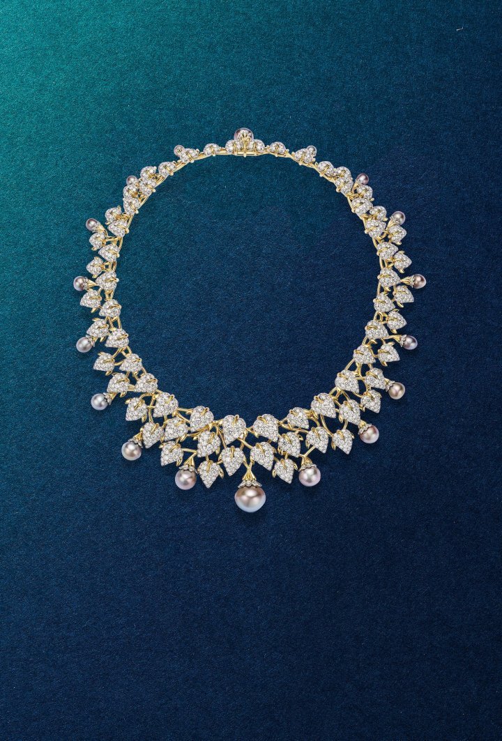 The Cascade necklace in platinum and 18k yellow gold is an extraordinary creation inspired by Jean Schlumberger’s celebrated Leaves necklace and designed by Nathalie Verdeille and the Tiffany & Co. Design Studio. Featuring 18 natural saltwater pearls totaling nearly 75 carats and 1,276 round brilliant diamonds of over 51 total carats, the design celebrates nature’s beauty through fluid gold vines and luminous pearls. Each pearl—sourced from the renowned Al Fardan collection, the world’s foremost authority on natural saltwater pearls—reflects exceptional rarity and luster. Beyond their extraordinary radiance, each pearl showcases exceptional size, color and gradation. Achieving such precise harmony across this breathtaking suite of natural pearls is a truly remarkable accomplishment.