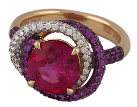 - Dharma: Ring in 18K pink gold (7.53g), set with a 3.03-ct natural vivid pink Burmese spinel, surrounded by pink sapphires (1.03cts) and white diamonds (0.39ct).