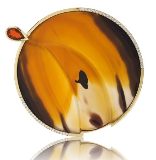 Diana Vincent created a shoulder brooch in gold, diamonds and pearls that embraces the theme not only literally, but conceptually as well. Titled ’Give Peace a Chance’, her design shares an inspiration common to many in the group: war, peace and its many accoutrements. Jose Hess crafted an onyx bomb with a yellow sapphire tipped fuse, and William Schraft a missile necklace in silver, gold and diamonds. An 11 ct oval Quartz is the landscape for two gold and diamond bullets in Cornelis Hollander’s ’Two Bullets is enough’, and a Brazilian Agate is the backdrop for Susan Helmich’s ’Aftermath’ pin in a beautiful but eerie image of what things may look like after all these bombs and missiles go off.