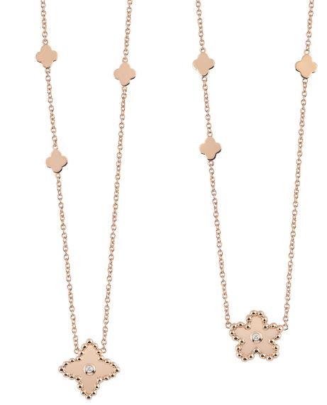 The Italian manufacture of jewelry Al Coro is presenting corresponding filigree necklaces in different lengths. Gentle flower pendants swing on filigree chains made of 18-carat gold. Little brilliant accents sparkle inside the flower like ice crystals. Worn individually or in combination, these elegant precious objects unfold their enchanting splendor. Homage to the beauty of nature.