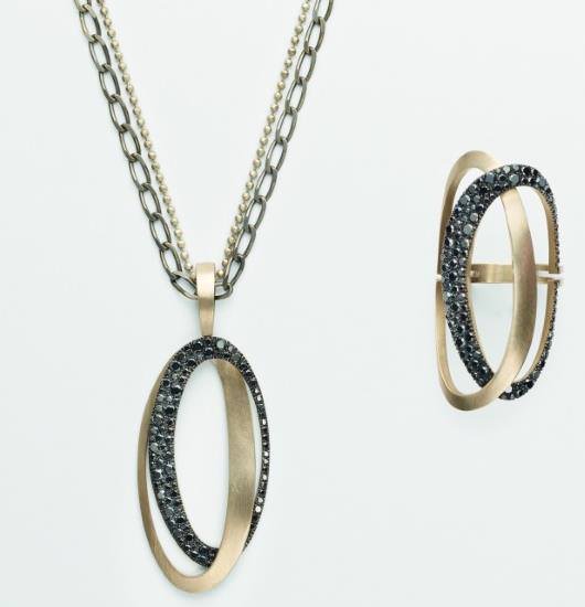 Smooth off-shaped ovals become rings, pendants and earrings, the pendants dangling from a double chain with different surface finishes, in polished black or white gold.