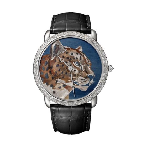 To get the beautiful effect of the panther’s coat onto the dial of this Ronde Louis XL watch, the gold plate is first heated to produce an initial base colour. It is then returned to the heat as many times as necessary until the full spectrum of colours has been reached.