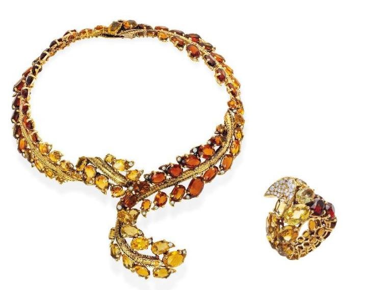 Highlighting the auction are jewels by renowned jewellery designer Pierre Sterlé, considered to be emblematic of 1950s and 1960s jewellery. In 1934 Sterlé set up his own atelier, in the Place Vendôme, and was considered somewhat of a revolutionary: atypical, audacious and talented, receiving the prestigious De Beers’ International Diamond Award three years in a row. Sterlé reinvented the art of manipulating precious metal, setting the gemstones in an elevated fashion reminiscent of the Baroque period; creating a sense of movement in supple and articulated mounts. He created mobile settings which enhanced the scintillation of the stones, varying their colour according to the light. His overruling ambition was to challenge the technical constraints of jewellery design, permitting him to translate the visions from his vivid imagination into jewels. He adored the effect of different colours of gold combined in one object and of varying textured surfaces. Leading pieces from the collection include a beautiful citrine and diamond necklace and ring set, (estimate: CHF40,000-60,000).