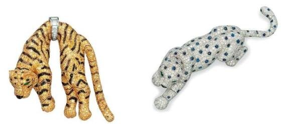 Jeanne Toussaint was appointed director of jewellery at Cartier in 1933 and went on to become one of the most influential jewellery personalities of the 20th century. She was given the nickname „The Panther‟ by Louis Cartier on account of her choice of panther skin rugs in her apartment, and was credited with the creation of „Big Cat‟ jewellery. The Duke of Windsor commissioned a panther brooch in the late 1940s, and since then the panther has become an iconic Cartier motif. The concept of the tiger being used in jewellery was inspired by a personal commission from Barbara Hutton, who requested a brooch and pair of ear clips depicting tigers, which became one of her signature jewels. The strong character of both these women is perfectly mirrored in these bold feline designs.
