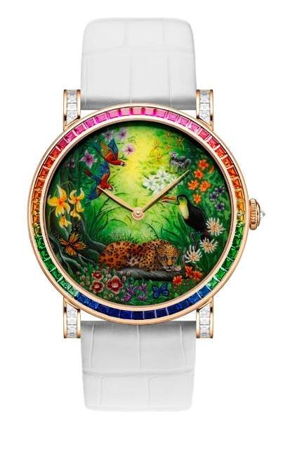 The Grand Feu enamelled miniature painting for this creation ishoused in a 42 mm red gold case set with a rainbow of 74 baguette-cut precious stones (8 rubies, 12 blue sapphires, 20 yellow and orange sapphires, 14 tsavorites and 20 diamonds) and 116 brilliant-cut diamonds. The piece also features a diamond-set crown. It is equipped with an automatic movement and an alligator strap with a red gold deploying buckle set with 24 diamonds. This pièce unique features a total of 3.60 ct of diamonds and a 3.11 ct combination of rubies, sapphires, tsavorites and diamonds.