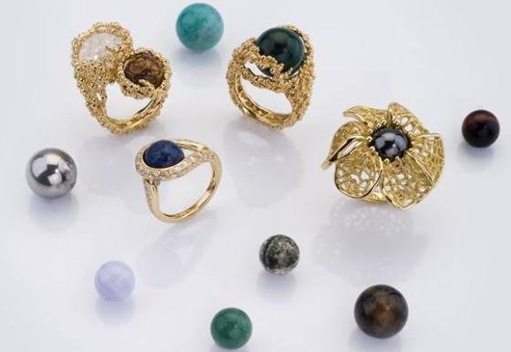 The interchangeable collection is versatile collection of rings, earrings and pendants that hold spherical stones of many colors and finishes that can be switched by the wearer to adorn any outfit and suit every mood. Gilbert Albert also offers jewel encrusted crosses, riding crops, walking canes, delicate bowls and decorative objects.
