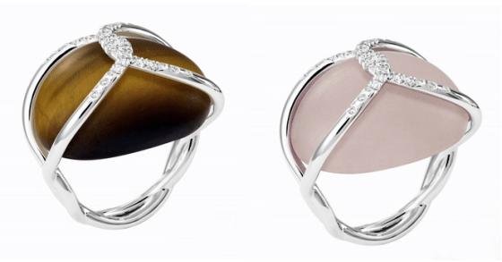 Lorenz Bäumer created his latest collection Samba witha ring and seven different interchangeable pebbles: Black onyx, red jasper, brown tiger eye, pink quartz, blue chalcedony, turquoise, and brushed pink gold.