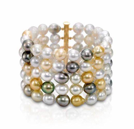 The Ocean gives up its greatest gifts and Mastoloni garners them to create a stunning Baroque pearl strand bracelet of ultra-exotic elegance and style. In delicate, aquatic hues of white, yellow, silvery grays and greens, this stunning, sensuous five strand bracelet from the Signature collection boasts a mix of Baroque Tahitian and South Sea pearls.