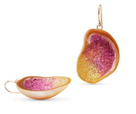 Second Place: Hisano Shepherd, little h, Los Angeles, for earrings made from a freshwater soufflé pearl cut in half and affixed with yellow and pink sapphires. Shepherd received a full library of MJSA Press publications.