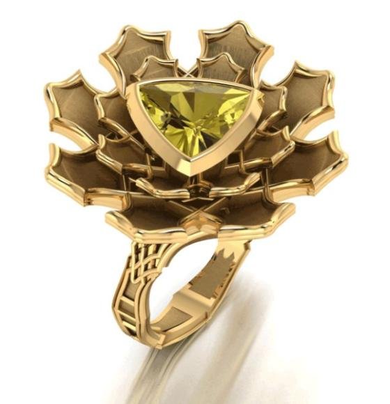 Interlock Ring. When she was a child, Hsinyu Chu’s favorite toy was a spirograph. She remembers loving to draw intricate patterns by using all the circle wheels and rings—once she got started, she couldn’t stop. Even as an adult she never tires of it, as it is one of the classic ways to create countless, amazing designs. Now she incorporates similar geometric patterns into her jewelry pieces. She manipulates the geometric elements in CAD, which she will print in resin and then cast in metal and set with desired stones.