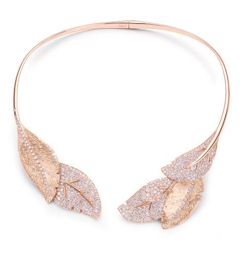The Extremely Piaget Palm Tree ring puts the leaf at the centre of the design, with the plant wrapping around the finger. The warm pink gold is given a life-like quality with its intricate detailing, and set with a sprinkling of brilliant-cut diamonds on the veins of the leaf for added sparkle . A bracelet sculptured out of gold represents one of Piaget unmistakable style signatures. Capturing the rays of light, the Palm Tree bracelet is the ultimate expression of a life of brilliance with the Palace decor pink gold leaves sensually encircling the wrist (G36LB400). A pair of matching earrings in pink gold elegantly dress the earlobes as two glowing palm leaves enhanced by the brightness of diamonds playfully capture the light. The two same palm tree leaves make an appearance on the ends of a lavish gold necklace glistening against her décolleté, or along the chain of a feminine sautoir floating and playing with the light.