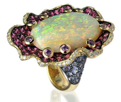 Stanislav Drokin - Ring in yellow gold 750, Australian crystal opal, red spinels, purple spinels, tanzanites, diamonds. Produced in a single copy.