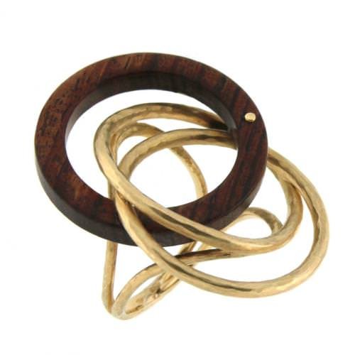 The softness of the matte hammered gold and the dark “satine” finished Bloodwood from Central America is a contrast in color and movement. The two materials intertwine in circles in Tribal to form an endless bond and infinite style.