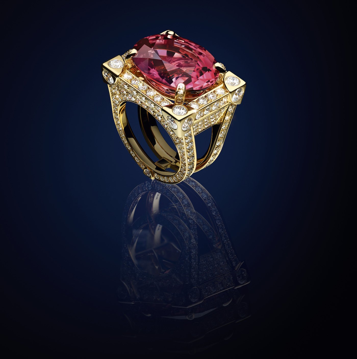 The rectangular silhouette of the iconic luggage is reflected in the framing of the main stone. The diamonds nestled between each tourmaline echo the metal studs on the trunk, resulting in a powerful, flamboyant piece of jewellery, in keeping with the quintessential aesthetic of Louis Vuitton High Jewellery. Additionally, three rings respectively set with a pink sapphire, a red tourmaline and a raspberry tourmaline are embellished with signature diamond accents.