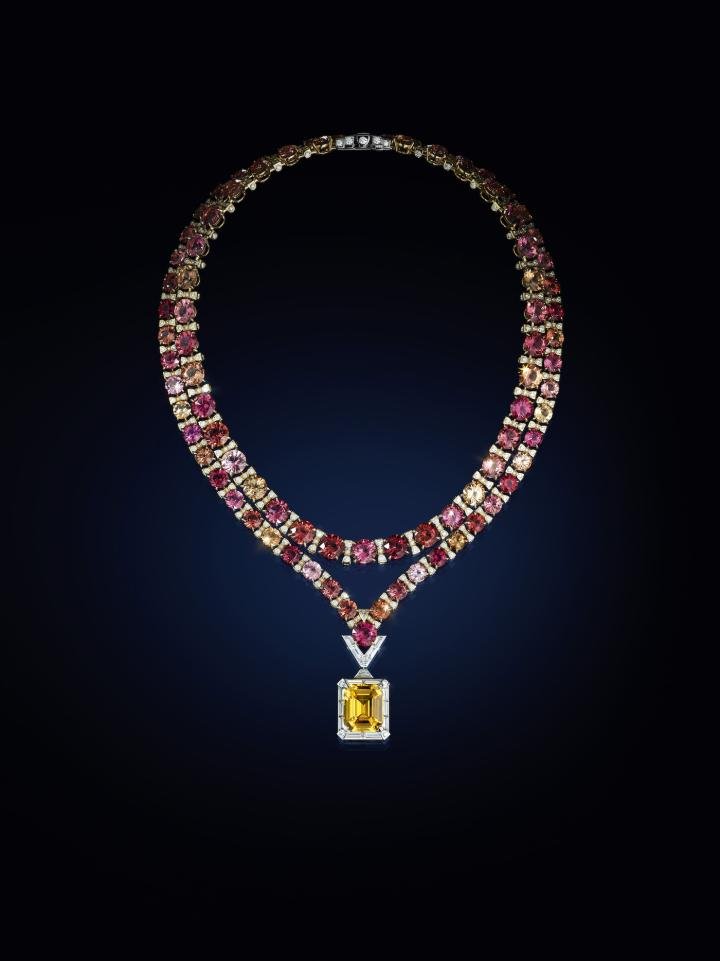 With a spectacular intensity, the yellow hue of this 20.29 carat cushion-cut sapphire from Sri Lanka captivates the eye. It is the focal point of the Le Magnétisme necklace, which boasts two rows of pink, orange and yellow tourmalines, totalling 152.86 carats of stones.