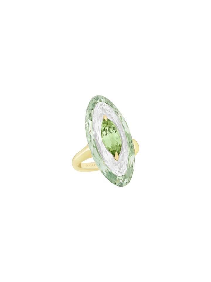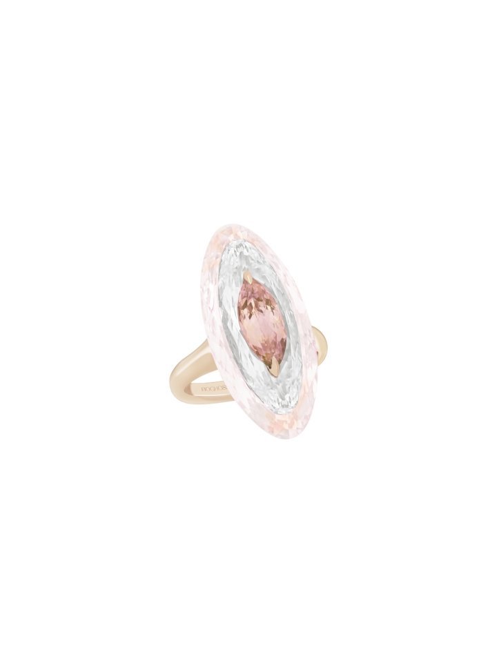 In this new chapter of Inlay Shine, Boghossian explores delicate colour harmonies. Pairings such as prasiolite with green tourmaline, rose quartz with morganite, and sky blue topaz with aquamarine are each enhanced by a layer of rock crystal, amplifying luminosity while preserving the softness of the pastel palette.