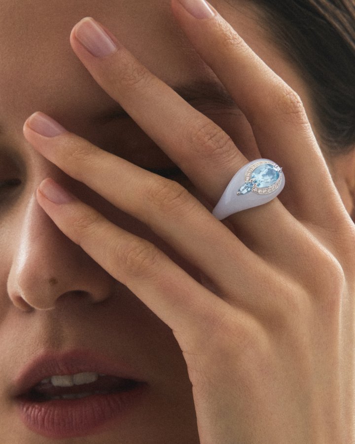 At the same time, Inlay Reveal is enriched by a new stone combination, pairing aquamarine with blue chalcedony to create subtle contrasts of transparency, softness, and depth. Together, the two stones form a harmonious palette of blues, where crystalline brilliance meets silky translucence in an elegant and contemporary design.