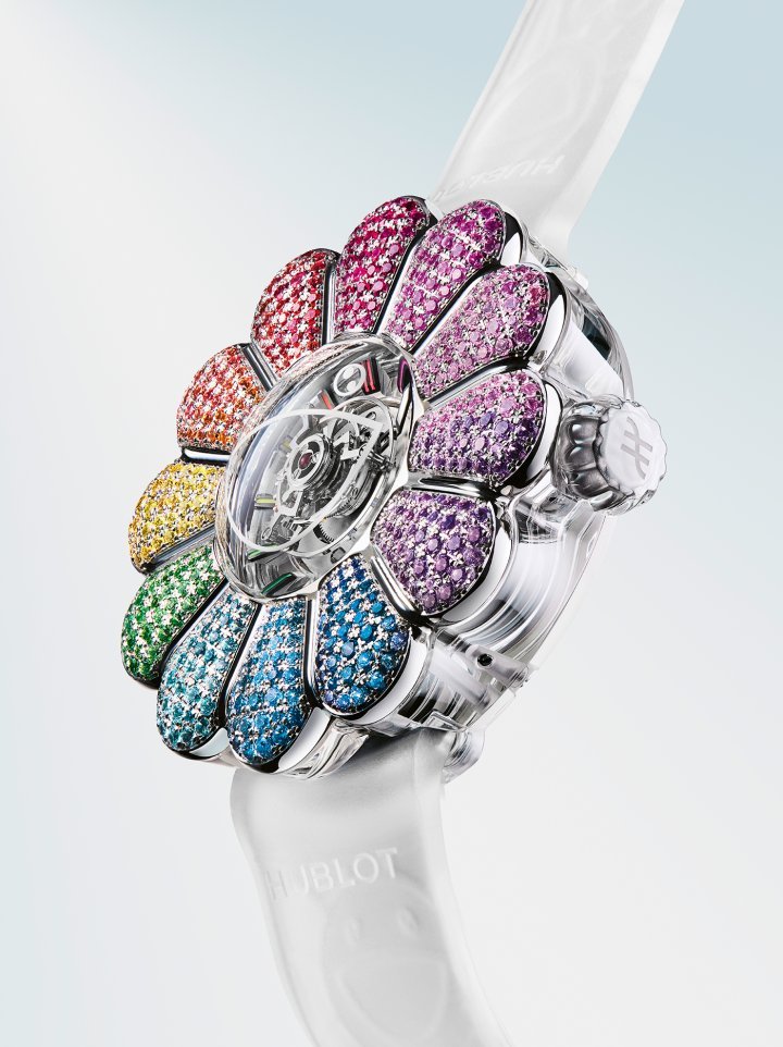 True to the Japanese artist’s highly chromatic palette, the twelve petals feature polished titanium inlays that are set with 444 coloured gemstones in total, including brilliant-cut rubies, pink sapphires, amethysts, blue sapphires, blue topazes, tsavorites and yellow or orange sapphires. These stones are grouped together so that each petal is in a different vibrant colour, just like the original Murakami smiling flower. A remarkable feat of gem-setting, combined with a truly revolutionary mechanical calibre.