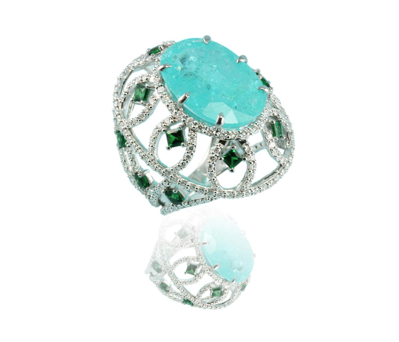 18K White gold ring with Paraiba, Tsavorite and white Diamonds by
