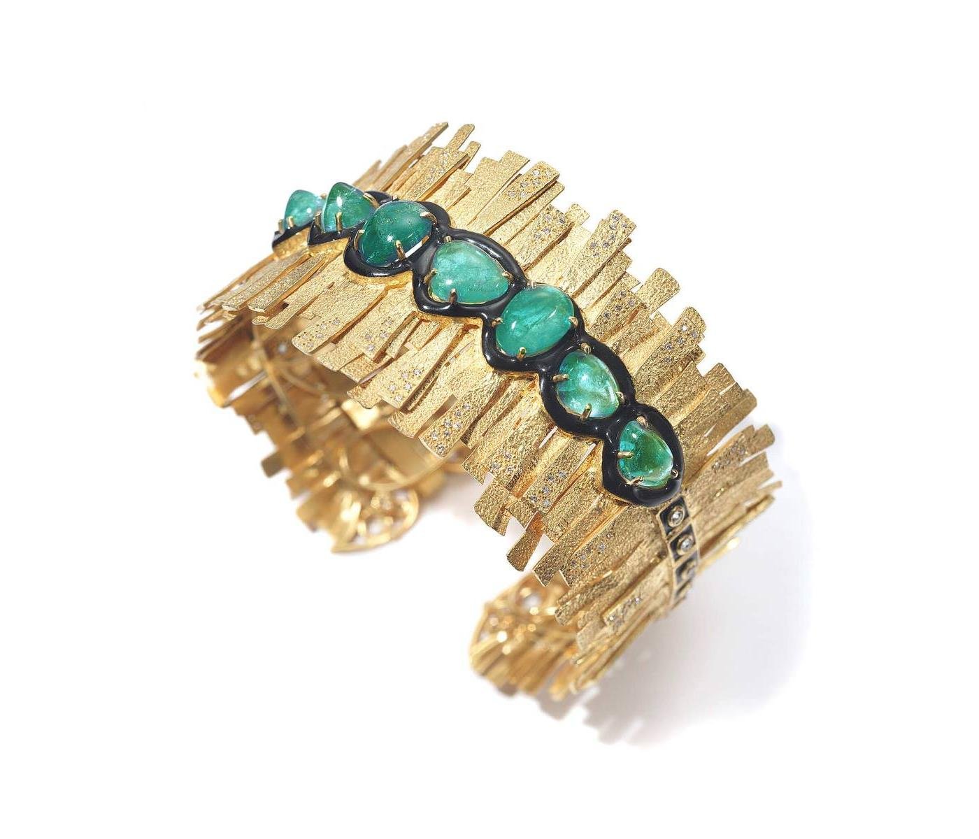 20K yellow gold with Muzo Colombian emerald, diamond, and black enamel by