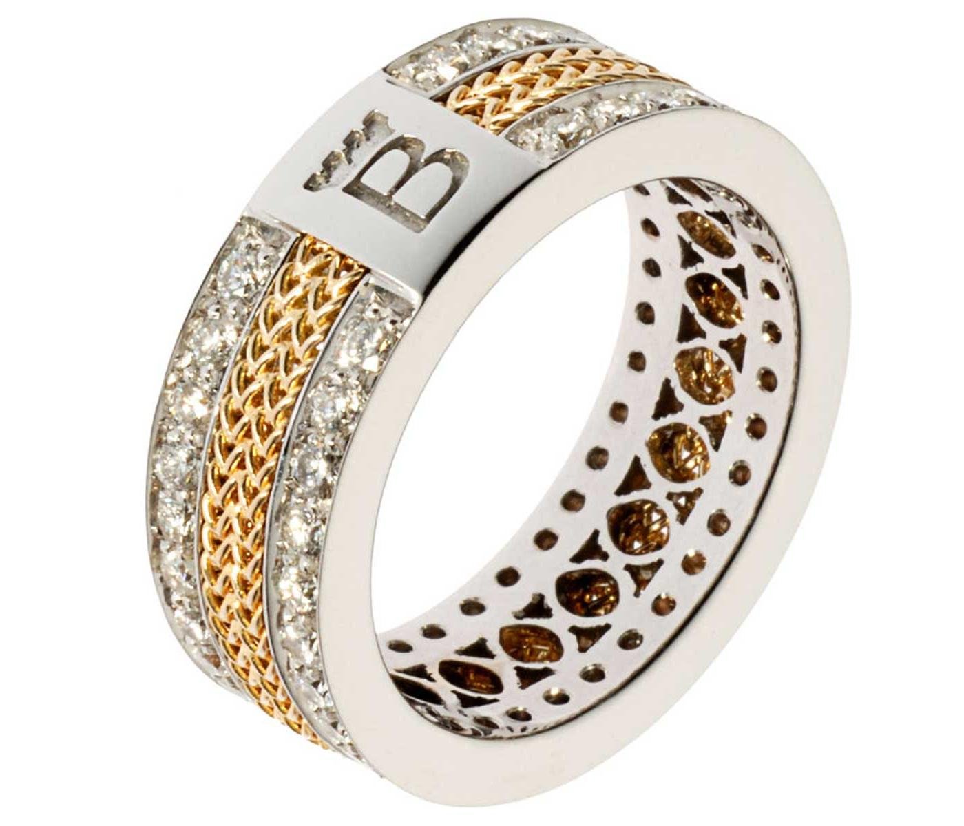 Ring in 18k white and yellow gold, with two rows of diamonds and a central one with chains by