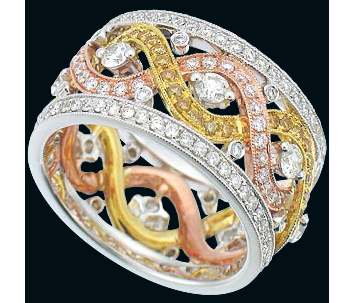 Tri-Gold ring in 18-carat white, yellow and rose gold with 23 yellow diamonds and 80 round diamonds by