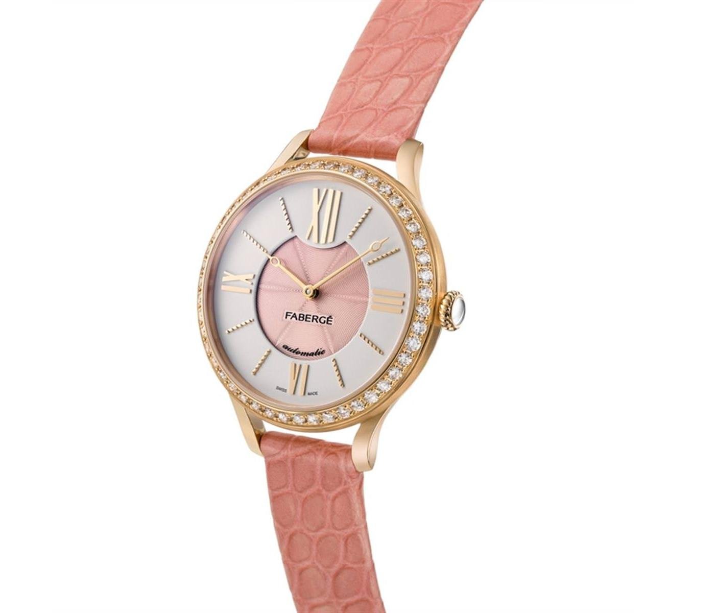 Watch with a pink guilloché and white lacquer dial, diamond set bezel and an automatic Vaucher Manufacture movement encased in a 36mm 18 karat rose gold case, with alligator strap by Fabergé