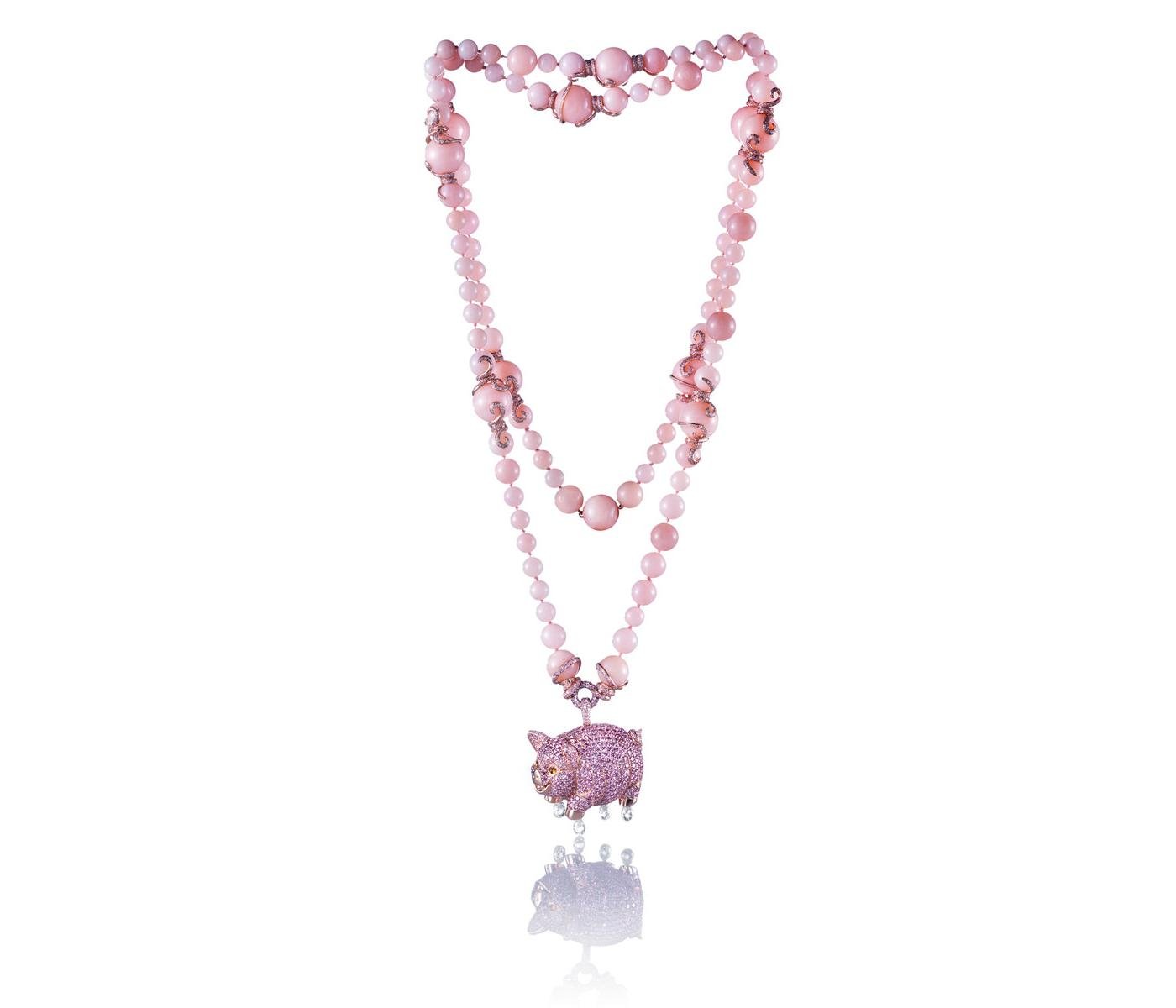 Pig necklace in 18 ct-rose gold, set with 104 pink round opals, pink diamonds, 4 white briolette cut diamonds and 2 round tourmaline cabochons by Chopard