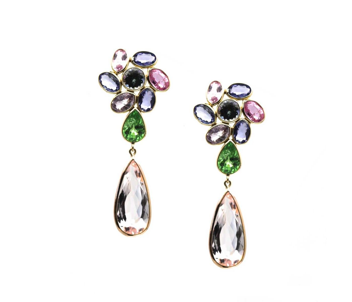 Mosaico Collection, tanzanite, pink torumaline, tsavorite garnet and morganite earrings in 18k yellow gold by Trésor