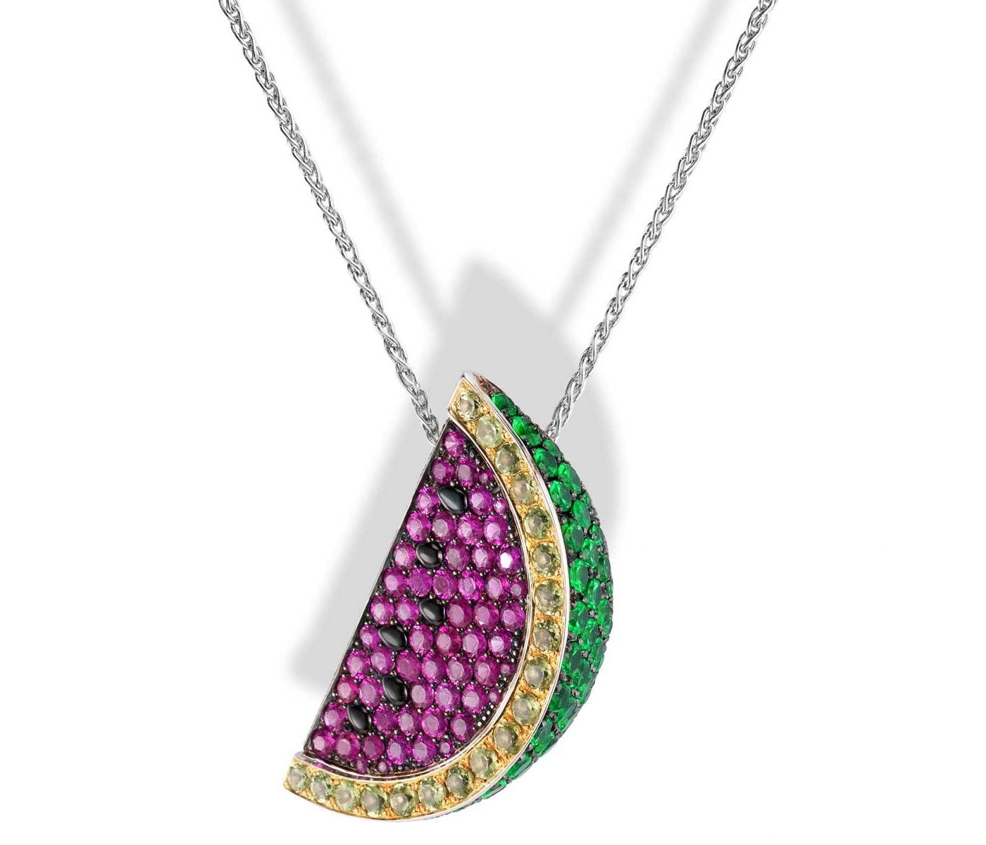 “Watermelon” pendant in white gold set with 78 dark pink sapphires, 56 emeralds, 19 peridots and 6 black sapphires. Chain in white gold by de Grisogono
