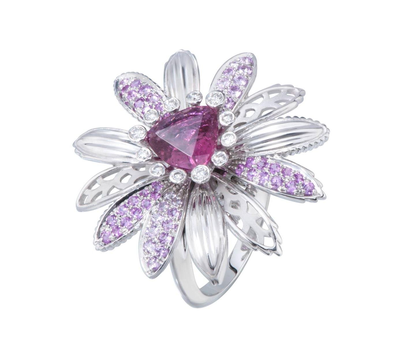 Ring in white gold, pink sapphires, tourmaline and diamonds by