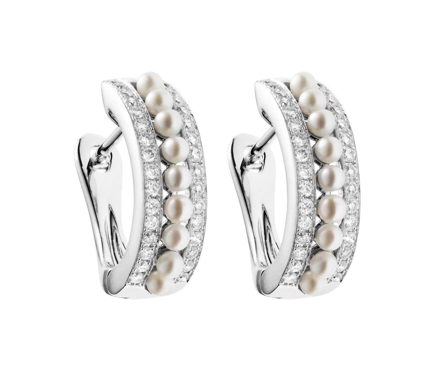 Grey gold earrings, round Akoya cultured pearls 2mm, 64 diamonds for 0.46 carats by
